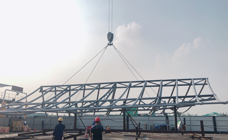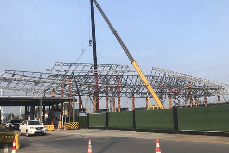 收費大棚造型約2000平方米,鋼結構主體桁架總重約為109噸,分五榀吊裝施工,首榀從8月27日開始吊裝,經過十多天的不間斷施工,9月8日鋼結構主體工程完工。