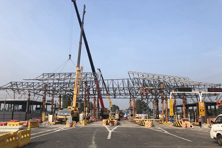 嘉通集團所屬交建公司負責人介紹道:“收費大棚鋼結構主體是整個項目的重大節點,決定著這個項目的進度,我們施工人員加班加點,加大攻堅力度,保障了重大節點按期完成。”