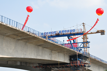 跨紅旗塘連續現澆箱梁是本項目跨境最長的變截面連續現澆箱梁,主跨長度120米,是連接本項目南北線路的關鍵節點。該連續箱梁橋的順利合攏,為灣北二期路面工程的推進打下了堅實基礎。