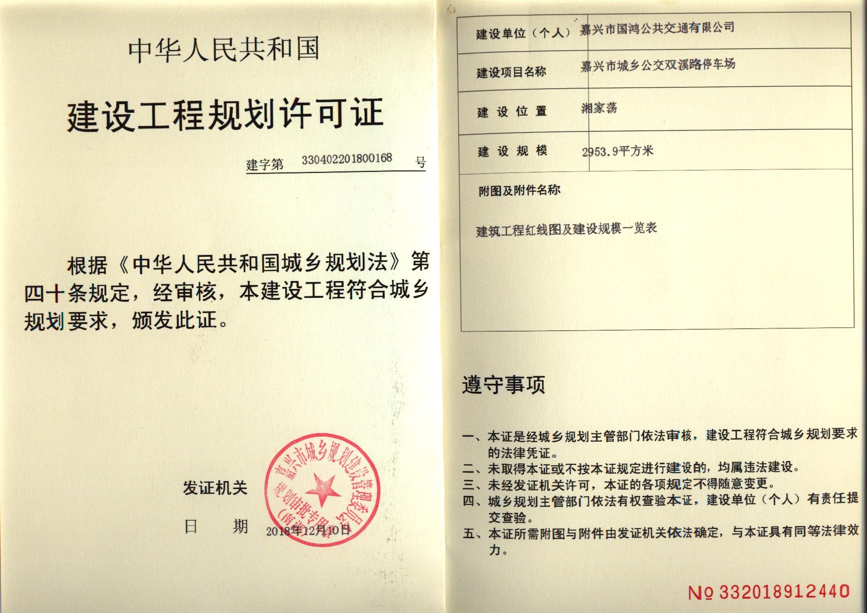 嘉興市城鄉(xiāng)公交雙溪路停車場建設(shè)工程規(guī)劃許可證